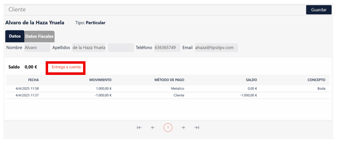 3. Seleccionamos "Entrega a Cuenta" dentro de la ficha del cliente.